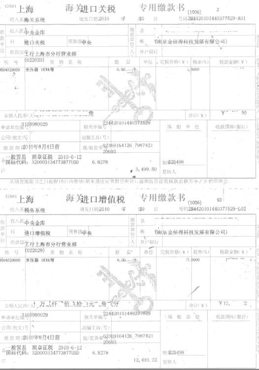 美国daykin变压器部分海关税单